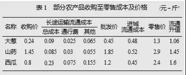 (1)通行費占農(nóng)產(chǎn)品流通環(huán)節(jié)成本的比例較小。以重點調(diào)研的幾種蔬菜為例,大蔥、山藥和西瓜各環(huán)節(jié)的價格詳見表1所列。表1中長途運輸流通成本中的“其他”包括裝卸、包裝、存儲、物品損耗、運輸燃油費、工人工資罰款和車輛維修等費用,“進(jìn)城流通成本”包括批發(fā)市場攤位費、進(jìn)城運輸費、停車費、罰款、超市攤位費和包裝、存儲、物品損耗等。從表1可以看出,大蔥、山藥、西瓜占長途運輸流通成本的比例分別為:28%、35%、33%,占總流通成本的比例分別為:4%、5%、11%,占產(chǎn)品最終銷售價格的比例分別為:1.2%、0.3%、3.1%。而3種農(nóng)產(chǎn)品在流通過程中每斤分別升值了1.06、1.45、1.6元,主要是從批發(fā)到零售這一環(huán)節(jié)增長的。由此可以看出,干線運輸中的通行費在農(nóng)產(chǎn)品流通過程所起的升值作用很小,即使通行費全免,也不會對收購價和零售價造成較大的影響。