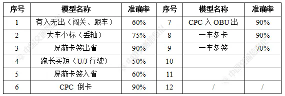 (四)稽核模型建立與準確率驗證本文所述AI稽核系統(tǒng)根據(jù)不同逃費類型建立對應模型,目前已實現(xiàn)大車小標、有入無出、屏蔽卡簽入省、屏蔽卡簽出省、跑長買短、CPC倒卡、CPC入OBU出、一車多卡、一車多簽等近10種偷逃費行為稽核。以大車小標偷逃費行為進行舉例說明。改變車型(車種):大車小標是指發(fā)行車型跟實際車型不符。通過非法手段辦理或套取使用與實際車型不符的車輛標簽,達到偷逃費的目的?;藬?shù)據(jù)驗證方式如下:(1)通過交易數(shù)據(jù)中的車牌、車牌顏色和車型與發(fā)行數(shù)據(jù)對比,確定大車小標;(2)利用入口稱重數(shù)據(jù),在收費數(shù)據(jù)中的入口交易數(shù)據(jù)搜索軸數(shù)與車型不符的車輛;(3)搜索收費數(shù)據(jù)中的入口交易數(shù)據(jù),車型為一型貨車,且車牌顏色為黃色的車輛;(4)篩選車輛通過ETC專道和人工車道的收費車型存在不一致的情況,通過車牌號篩選某個車牌多次出現(xiàn)兩個及以上的車型的車輛;(5)對篩選出的車輛,根據(jù)大數(shù)據(jù)平臺圖片、交易數(shù)據(jù),對特征點進行對比分析,形成初步結論。通過對稽核模型分析數(shù)據(jù)與稽核人員核實數(shù)據(jù)對比分析,進行稽核模型分析篩查準確率驗證,稽核模型準確率如表2所示。屏蔽卡簽、倒卡通行介質(zhì)等稽核模型準確率較高,達90%,有入無出(闖關、跟車)、跑長買短(U/J行駛)因系統(tǒng)及計費規(guī)則、現(xiàn)場管理和證據(jù)獲取等多重因素影響,準確率為50%~60%左右,但能夠滿足稽核業(yè)務需求?;四P蜏蚀_率如表2所示。
