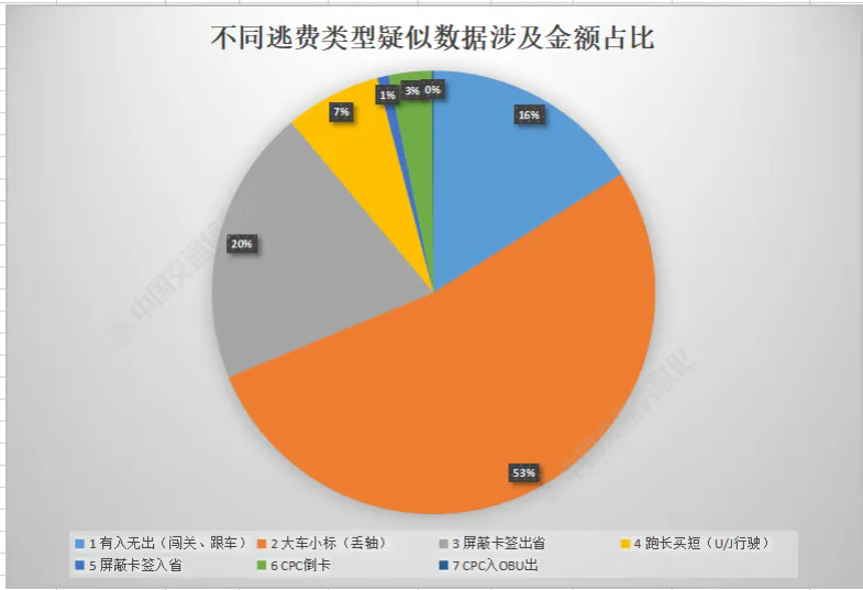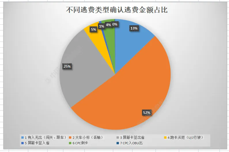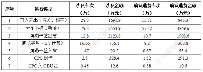 分析可得,有入無出(闖關、跟車)、大車小標(丟軸)、屏蔽卡簽出省和跑長買短(U/J行駛)等4種逃費類型分別占據(jù)涉及行程數(shù)的96.87%、疑似損失金額的95.9%,是稽核系統(tǒng)需加大核查力度的逃費類型,特別是屏蔽卡簽逃費車次占為11%,逃費金額占比卻達25%,以全網(wǎng)聯(lián)網(wǎng)收費運行模式下出現(xiàn)的新型逃費類型,需要從技術、管理等多方面加強管理。有入無出(闖關、跟車)和跑長買短(U/J行駛)2類逃費類型確認逃費金額占比有所下降,直接原因是稽核模型準確率不高。下一步應持續(xù)優(yōu)化迭代這2類模型,盡可能提高其準確率,從而不斷提高可追繳比例。