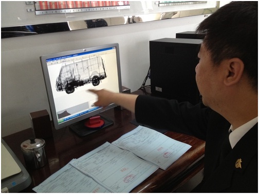 很快嫌疑車輛的掃描圖便呈現(xiàn)在了綠通快檢系統(tǒng)的客戶端上。查驗關(guān)員發(fā)現(xiàn),該車其他部位圖像顯示都正常,只有輪胎部位顯示的是重重的黑影,而正常輪胎成像應(yīng)是白色。關(guān)員由此判斷,貓膩就出在輪胎里。